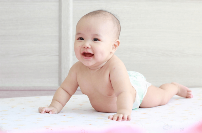 As your baby gets better at tummy time, it is time we up his level by putting out toys all around him to pique his interest. Squeaky and rattling toys make great props to get your baby’s attention! Leave his favourite toy just a teensy bit out of reach before him; the baby genius in him will get to working and start figuring out how to get hold of his toy. Be his biggest cheerleader and keep encouraging him!