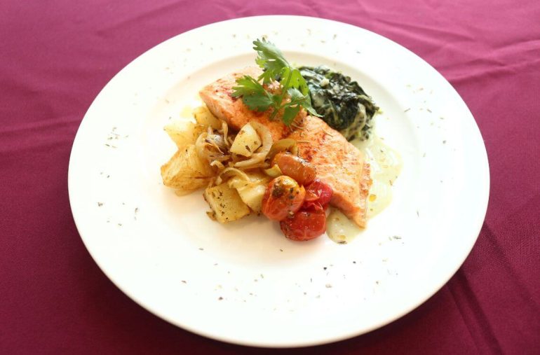 Oven-Baked Salmon with Creamy Spinach Tomato and Baked Herbs Potato