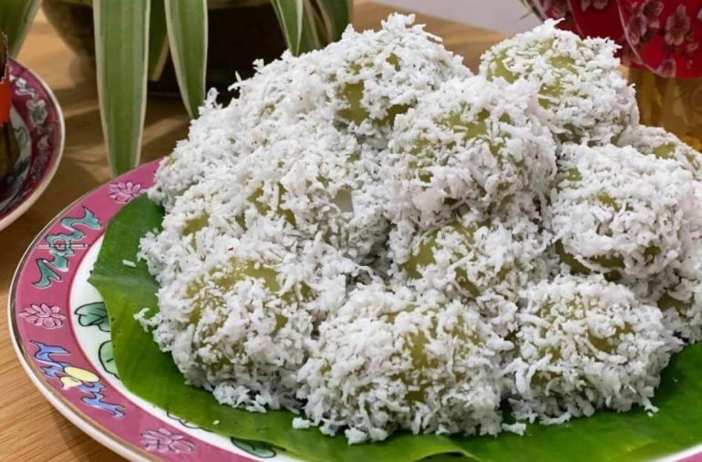 The secret to making these onde-onde without them leaking is to boil a lump of dough until they are cooked and add back into the raw dough to stabilise the dough. Knead them together and leave to rest for 15 minutes. This way, the palm sugar won’t leak while shaping and boiling them. Enjoy your onde-onde!