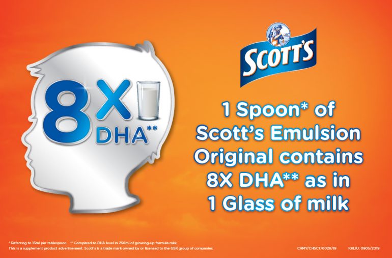 One spoon of Scott’s Emulsion Original contains 8X DHA as one glass of milk. All you need to do is give your child one spoon (15ml) of Scott’s Emulsion Original every day for healthy growth and development.