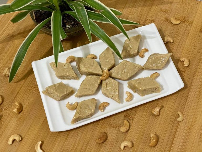 This traditional Indian sweet is made using only 3 ingredients—ground cashew nuts, sugar and water. You may add saffron or cardamom, too. It is extremely easy to make and is suitable for vegans. My neighbour usually decorates the top of her cashew fudge with silver foil but I was told that it is optional; just like how saffron or cardamom is not a compulsory ingredient but can be added for enhanced result.