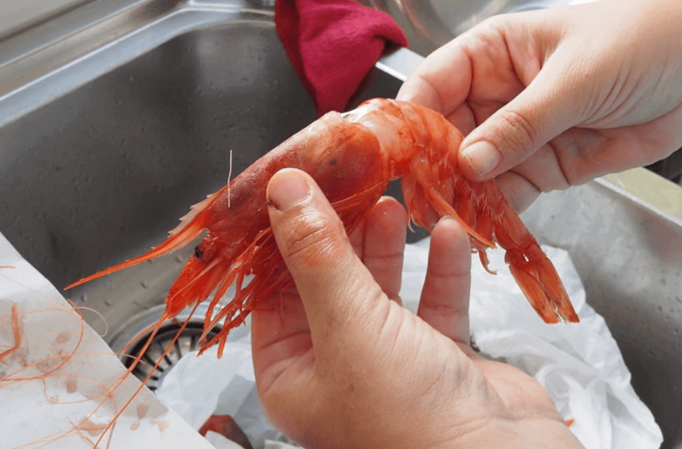 4. Seterusnya, pegang udang dan gunting di bahagian belakang badannya.