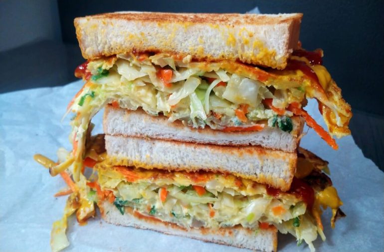 - Pindahkan omelet kubis ke sekeping roti yang telah dibakar. Letakkan sos cili, omelet kobis dan keju.
