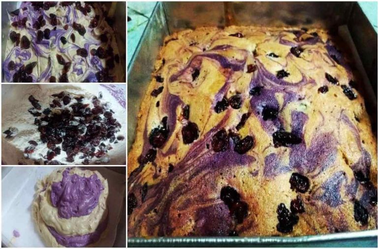 - Setelah itu, bahagikan adunan kepada dua bahagian. Satu bahagian dibiarkan kosong dan satu bahagian lagi tambahkan pewarna ungu dan emulco blueberi atau cranberry tadi.